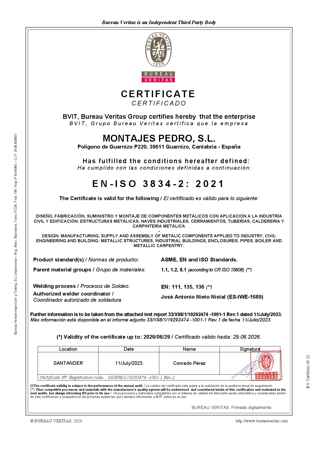 A petición del cliente o en aquellos productos en que la normativa vigente asà lo exija, MP puede aplicar la ISO 3834-2 al proceso de soldadura.